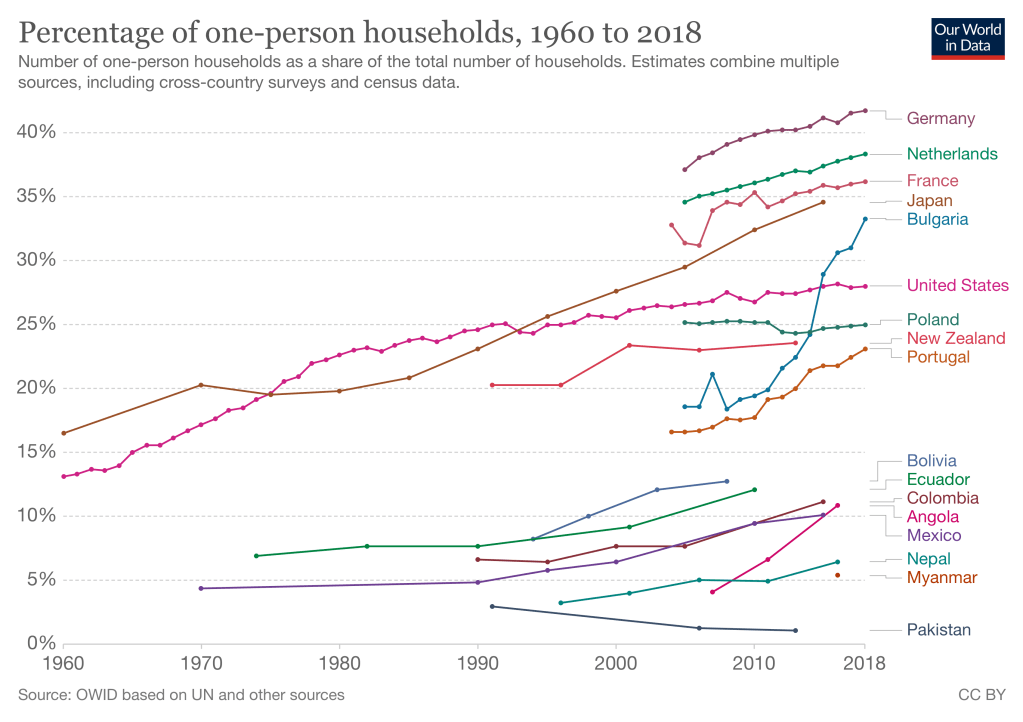 This problem is particularly pronounced in single-person households, which have been on the rise throughout the world, including in the U.S., where more than one-quarter of households are composed of one person. The trend toward living alone (which is interestingly counterintuitive to our evolutionary programming) has been somewhat well documented, including Eric Klinenberg’s book Going Solo: The Extraordinary Rise and Surprising Appeal of Living Alone and Steven Kurutz’s 2012 New York Times article “One is the Quirkiest Number,” among other works.