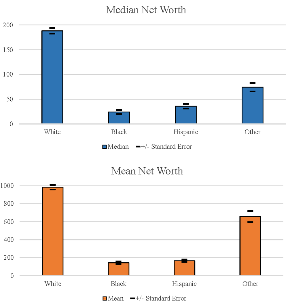 Data from the Federal Reserve starkly illustrates the vast disparity between the net worth (graphed below in 000s of dollars) that White families have compared to Black, Hispanic, and other ethnicity families in the U.S. It’s probably fair to assume that most wealthy white business executives know and understand this reality–most simply don’t have the audacity to verbalize its influence on their decision-making processes.